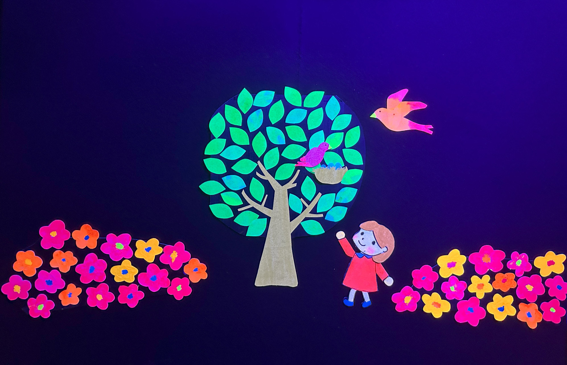 パネル布を貼った舞台に不織布で作られた絵人形を貼ったり外したりして展開する劇です。目の前で動く絵人形と演者が語りかけ進めていくお話や歌に子ども達は夢中になります。演者とのコミュニケーションが生まれ参加型で親しみやすいスタイルが魅力です。絵人形が光るブラックパネルシアターも幻想的で心に感動をもたらします。